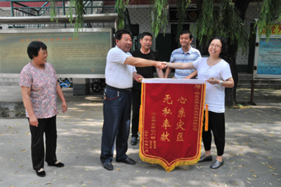 在村委會大院里,舉行了簡短的捐贈儀式。 王德英代表全村600多名受災(zāi)鄉(xiāng)親,從光源公司辦公室主任劉琛手中接過5000元人民幣,連連表示感謝,并向光源公司贈送錦旗一面,上寫“心系災(zāi)區(qū),無私奉獻”。光源公司業(yè)務(wù)經(jīng)理郭暉從王德英手中接過錦旗,握手合影留念。