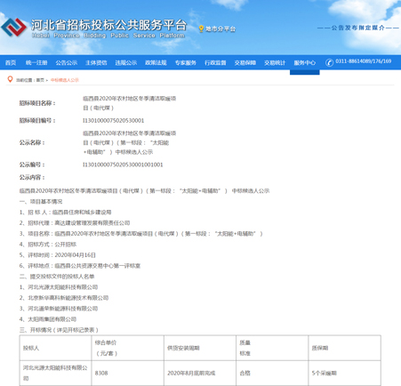 2020年,一場突如其來的疫情席卷全國,蔓延全球。隔離疫情不隔離服務,在此特殊時期,光源公司積極踐行企業(yè)社會責任,保障復工復產(chǎn)的同時統(tǒng)籌疫情防控,嚴防死守全面做好疫情防控工作,科學有序復工復產(chǎn)。全體光源人振奮精神,團結(jié)協(xié)作,高效率、高質(zhì)量投入復工后的公開投標項目,憑借三十余年行業(yè)經(jīng)驗和口口相傳的業(yè)界優(yōu)良口碑,以及雄厚的綜合實力,持續(xù)為客戶提供優(yōu)質(zhì)的產(chǎn)品和專業(yè)的售后服務。河北光源太陽能科技有限公司,中標臨西縣2020年農(nóng)村地區(qū)冬季清潔取暖項目(電代煤)(第一標段:“太陽能+電輔助”)。