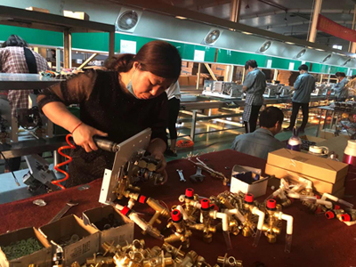 壁掛爐車間,兩條流水線上,工人們干的歡。他們的口號(hào)是:“奮斗在肩,奮斗有我!”